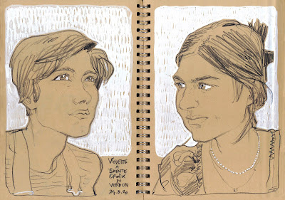 | Violette et Jeanne, apéro après la plage à Sainte-Croix du Verdon crayon noir et posca blanc sur papier craft |